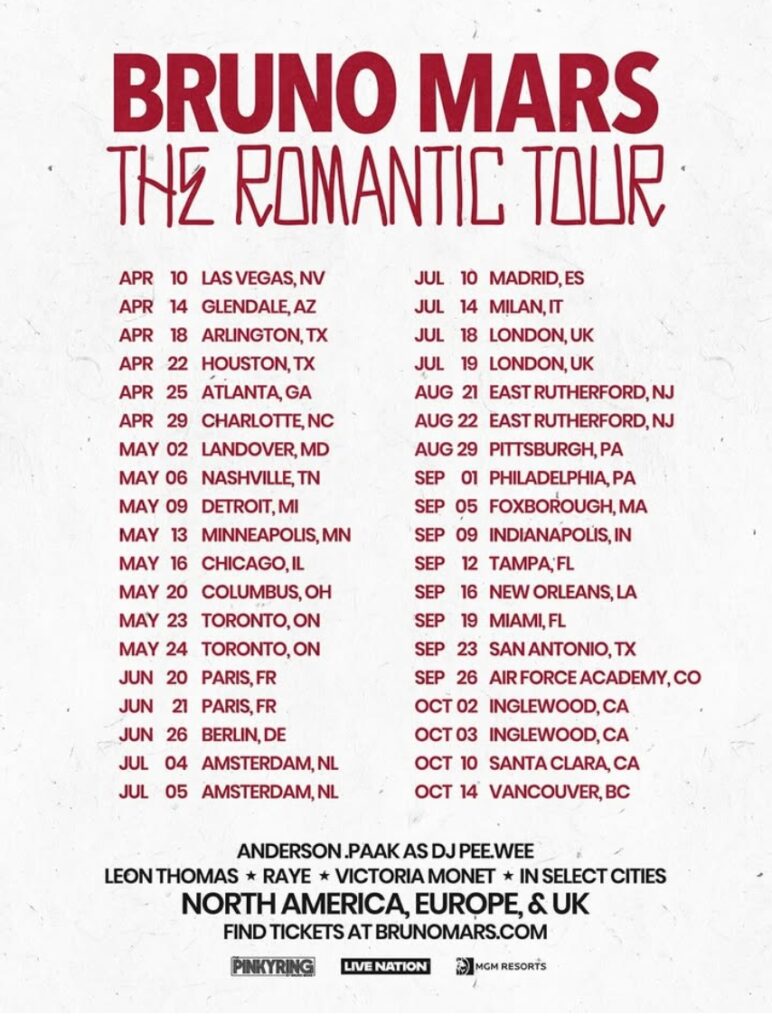 La nueva gira mundial de Bruno Mars, «The Romantic Tour, comienza el 10 de abril en Las Vegas.