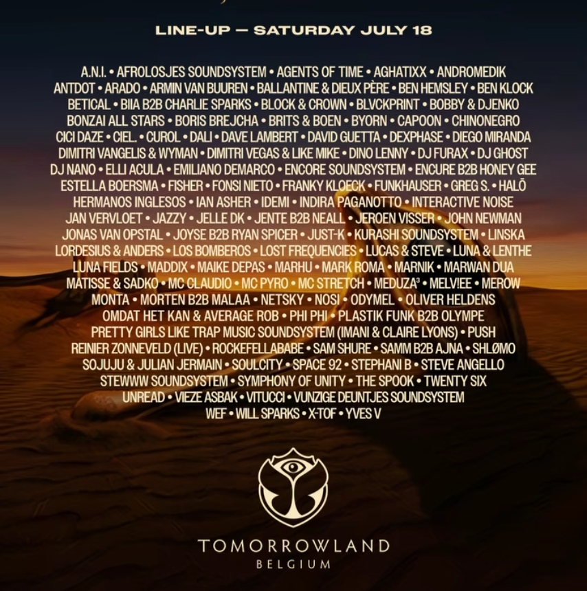 El amplio cartel de este año incluye la primera aparición en Tomorrowland Bélgica del gigante del género, Calvin Harris, quien actúa en el festival original tras su primera aparición en Tomorrowland U.S.A en 2013.