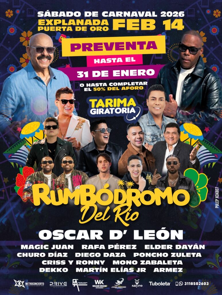 Barranquilla ya empieza a vibrar al ritmo de su Carnaval 2026. y dos grandes espectáculos prometen marcar un antes y un después en la historia de la música de la ciudad. El Rumbódromo del Río 2026 se tomará la Explanada Puerta de Oro durante dos días consecutivos, 14 y 15 de Febrero, con una nómina de lujo que reunirá en un mismo escenario lo mejor de la música latina.