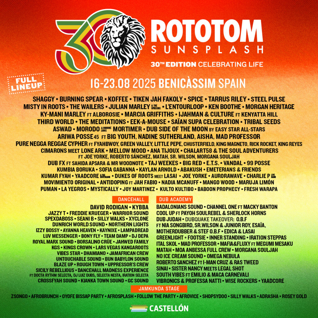 El festival internacional reggae más grande de Europa se celebrará del 16 al 23 de agosto de 2025 en Benicàssim bajo el formato abierto, ecléctico, inclusivo y sostenible que ha mantenido desde sus orígenes. Una seña de identidad que arropa la igualmente idiosincrática programación diurna, con áreas de actividad cultural y extramusical adaptadas al público familiar, que convive con la completa agenda musical proyectada en su media docena de escenarios.