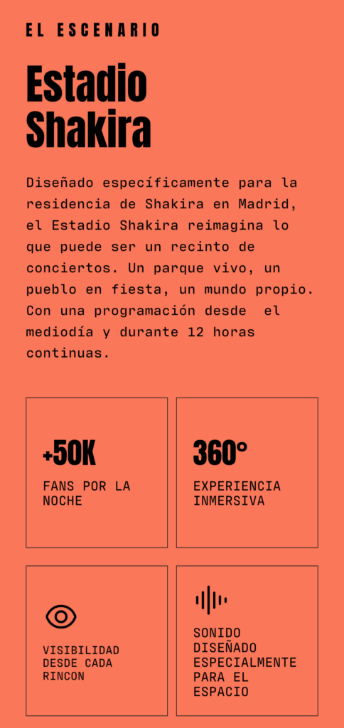 La residencia madrileña tendrá lugar en el “Estadio Shakira”, un recinto temporal construido especialmente para la ocasión en el barrio de Villaverde, al sur de Madrid, con capacidad para más de 50.000 asistentes por noche. Los organizadores explicaron que el recinto, ofrecerá mucho más que música, con espacios para el ocio, el arte, la gastronomía y otras experiencias culturales.