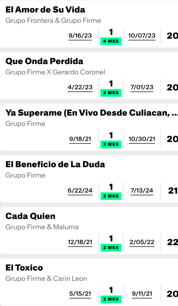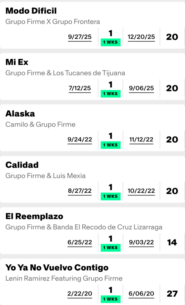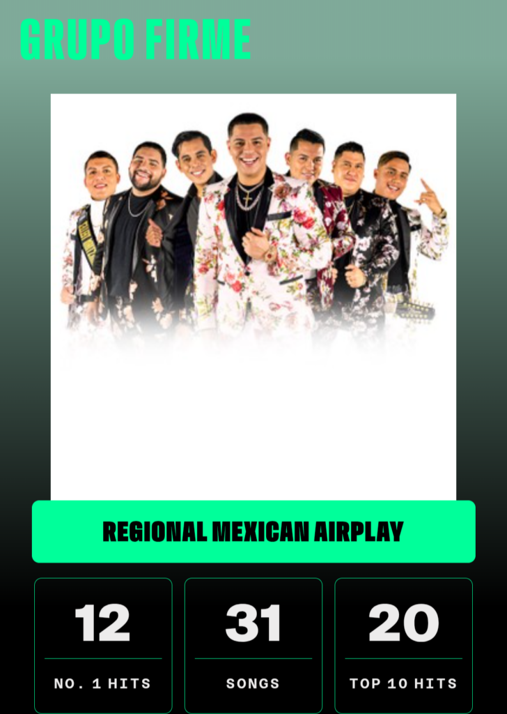 Grupo Firme ha tenido 31 éxitos en la lista Regional Mexican Airplay de Billboard, de los cuales 20 han logrado los diez primeros y 12 el primer lugar